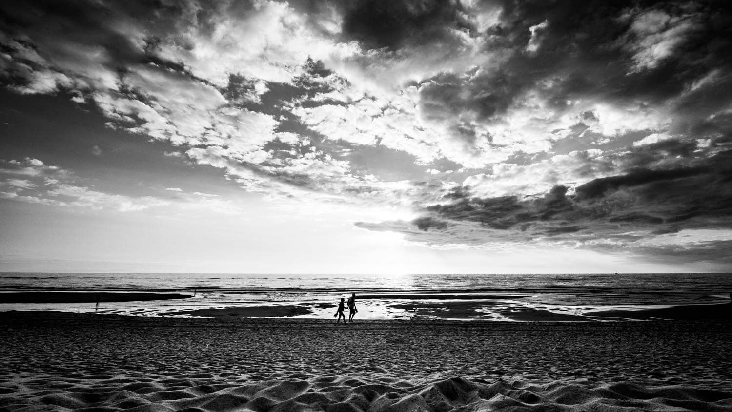 Weil ein schwarz-weißer Strand irgendwie nach „einsamer Poet“ aussieht – selbst wenn links der Typ mit der Drohne steht und rechts gerade jemand sein Fischbrötchen fotografiert.