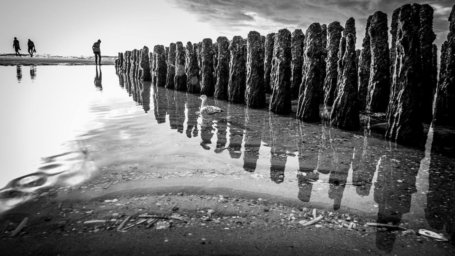 Weil ein schwarz-weißer Strand irgendwie nach „einsamer Poet“ aussieht – selbst wenn links der Typ mit der Drohne steht und rechts gerade jemand sein Fischbrötchen fotografiert.