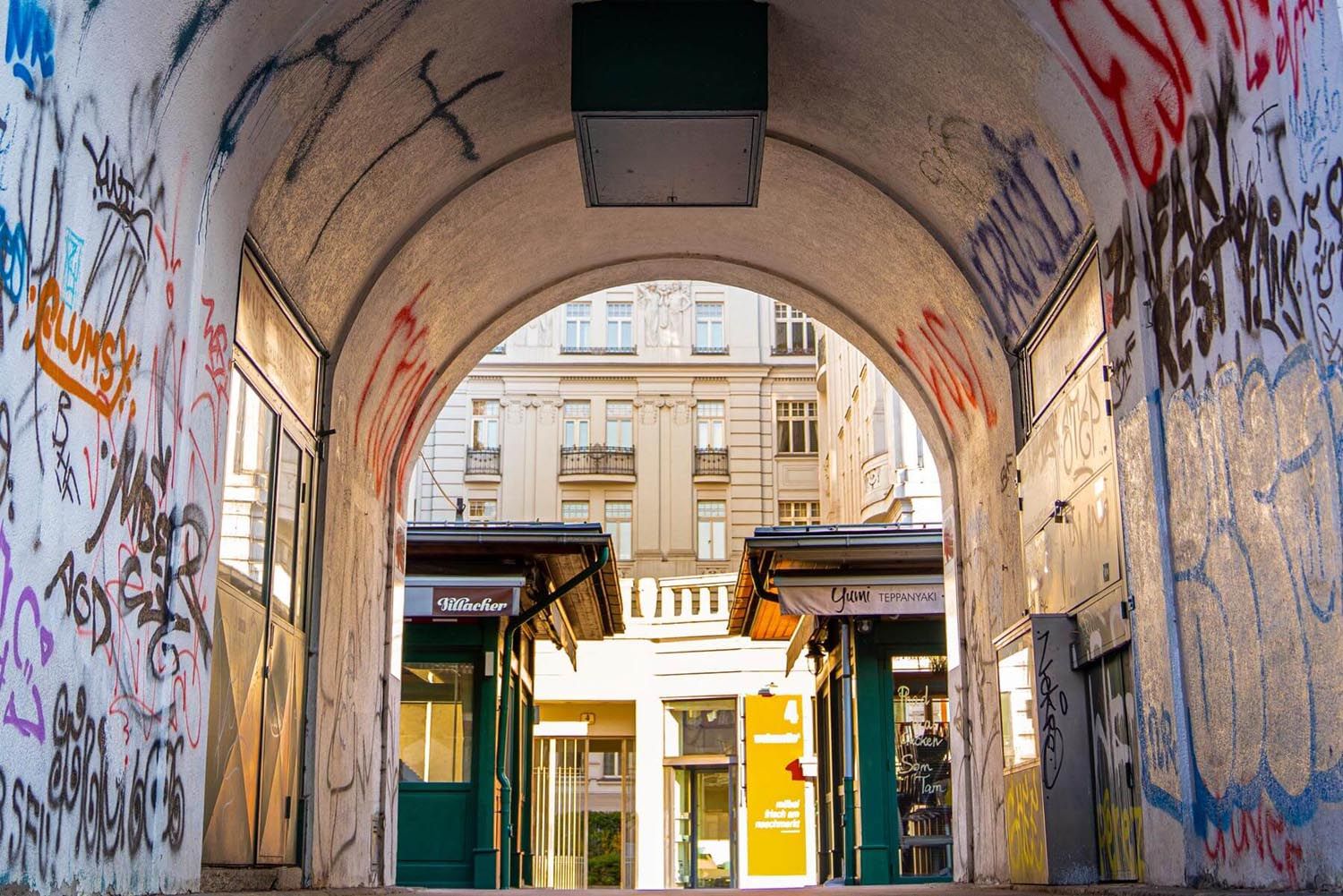 Ich hatte auf das bunte Treiben frühmorgens und entsprechende Fotos gehofft, wie die Marktstandler Obst und Gemüse sorgfältig schlichten und auftürmen, die Sauerkrautfass‘ln herausschieben, mir frische Falafel oder Oliven entgegengestreckt werden, sich die ersten Kundschaften die schönsten Waren schnappen, wie es überall nach frischem Gebäck, Gewürzen und orientalischen Delikatessen duftet. Aber nix da. Zahlenmäßig sind den Marktbesuchern die Tauben haushoch überlegen. Die meisten Buden sind verplankt und dienen den Sprayern nächtens als perfekte Unterlage für ihre Graffiti-Kunst. So gesehen sind es doch ein paar bunte Fotos vom Naschmarkt geworden. Während unser Bundes-Basti von der Feuermauer herab kalten Herzens auf den Markt blickt, spaziere ich in den Ersten, wo sicher mehr los ist. Wien ist anders, aber trotzdem schön!